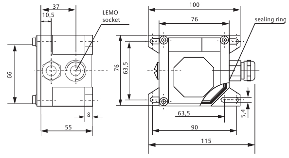 The CON011 Signal Converter is accommodated in a rugged housing, the electronic components are completely sealed. Connection of the eddy current probe is made with a LEMOSA connector at the front of the converter. A M20 tapped bush allows the protection ofthe sensor cable by means of a cable protection tube set MPT 064/.. . Supply circuits for the eddy current probe and the measuring electronic are contained in the converter. The nominal supply voltage for the converter is 24VDC, the nominal range of the output signal −proportional to the nominal measuring range of the sensor− may be set to either –4...−20 or –2...−18V. With the converters for the special measuring range (CON 011 / 91x−xxx) the output voltage is firmlyadjusted to the range −4... −20V.